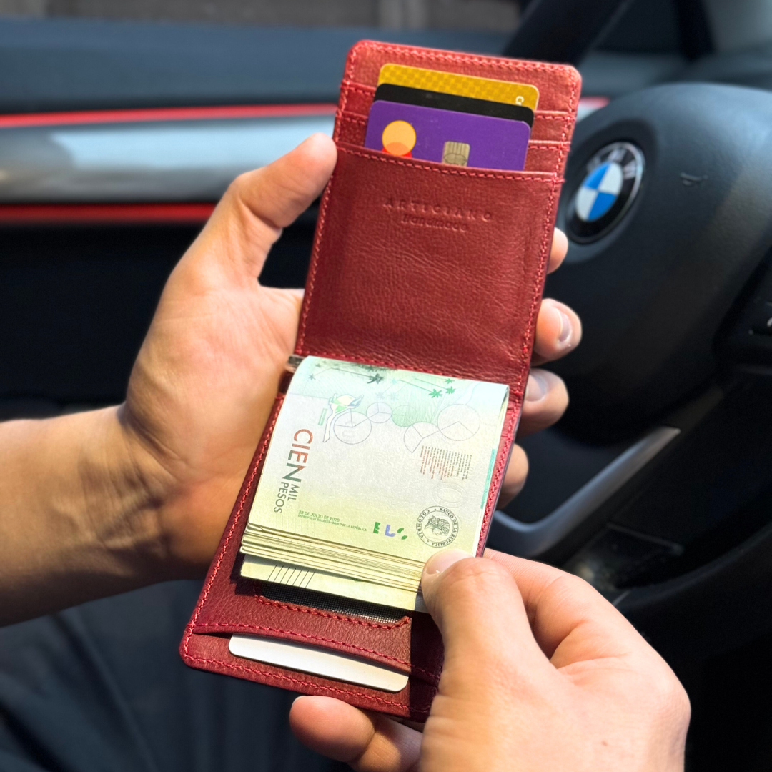 Hecha a mano en cuero genuino por artesanos colombianos, pensada para quienes buscan comodidad, estilo y durabilidad en una sola billetera.